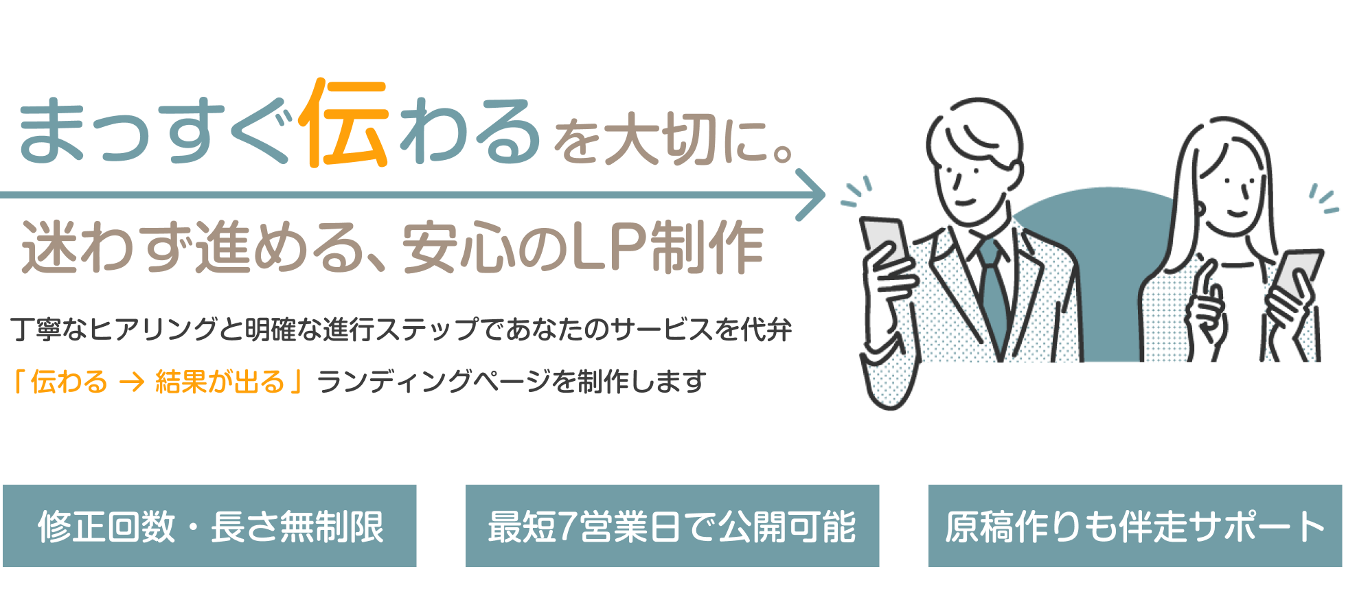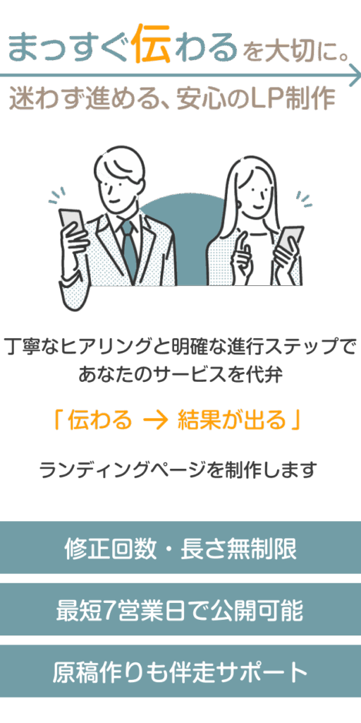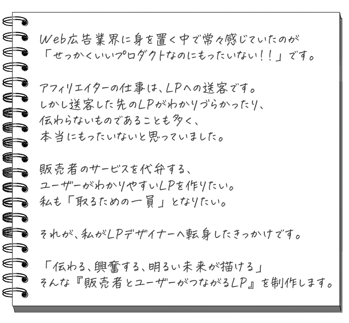メニュー エフスターの特徴 製作内容 納品までのステップ よくあるご質問 無料相談/資料請求 資料請求 エフスターの5つのポイント POINT:01 修正回数&長さ無制限で納得がいくまで! 「修正回数は3回まで、それ以降は追加料金がかかります」 「〇〇pxまで〇〇円、以降〇〇pxごとに〇〇円追加」など、修正回数や長さによって追加料金がかかる制作会社等は多いです。その点エフスターのLP制作は、修正回数・長さともに無制限。「本当はもっとこうしたいんだけど高くなるし…」と料金で諦める必要はありません。 POINT:02 ご準備で迷わない! 制作のためにご準備いただきたいものをまとめたPDFや、必要な情報をお伺いするヒアリングシートをご用意しております。「はじめての依頼でどうしていいかわからない」「何をどう伝えればいいのか難しい」といった心配はいりません。ご不明点等はいつでもフォローいたします。 POINT:03 原稿作りも伴走サポート! 原稿のご準備が難しい方には、原稿作りもサポート。穴埋め式で記述いただけるライティングサポートシートをご用意しております。頂いた情報をもとに訴求・CVにつながるよう、補足・改善を加えて原稿を作成いたしますので、別途ライターを依頼する必要はありません。 LPは読ませる順番が重要!!商材にあわせた最適な構成で、CVまでの導線をしっかり設計します。 POINT:04 明確ステップ&ワンストップでスムーズに制作! 納品まではたったの6ステップ。しっかりしたフローで進行しますので、お忙しいお客様にムダなお手間をかけさせません。またヒアリングから構成作成、ライティング・デザイン、構築、ネット公開まですべて一人で担当しますので、ご依頼をブレさせること無く、スピーディーなLP制作が可能です。 スムーズな制作ができるフローで進めますが、一方的な制作ではありません!ご意見やご要望をいただきながら、「お客様と一緒に」作り上げていきます。 POINT:05 最短7営業日で納品! 制作内容にもよりますが、素材等をお送りいただいてから最短7営業日での納品が可能。※納品実績ありエフスターでは納品=ネット上に公開なので、すぐにLP運用をスタートできます。 きれいなだけ、文章を並べるだけでは売れません LP(ランディングページ)はその名の通り「着地ページ」LPからどこにも逃さずに、CVボタンまで誘導しなければなりません。まっすぐ伝えて誘導するために、エフスターでは「構成」「原稿」「デザイン」すべてにこだわってLP制作をしています。 LPは、いいことを書けば売れるわけではありません。誰がどこでつまずき、どんな順番なら「読み進めたくなるか」。エフスターでは、行動につながる流れを先に設計します。 ヒアリングをもとに、サービスの強みや価値を一緒に整理。「なんとなく良い」を「ちゃんと伝わる言葉」に落とし込みます。原稿はしっかりサポートしますので、文章を書くのがが苦手な方でも大丈夫です。 目立たせたいのは、装飾ではなく「伝えたい内容」。エフスターでは余白や文字のリズムを整え、内容が自然に入ってくるデザインを重視します。またスマホでも読みやすく、行動につながるデザインを心がけています。 長年のWEB制作で培ってきた知識を活用し 成果にこだわったLP制作 をいたします!! エフスターは料金内でここまでやります 構築 WordPressを使ったノーコード制作 WordPressインストール レスポンシブデザイン スマポンシブデザイン スワイプLP(縦・横) ファビコン設置 Googleマップ埋め込み 動画埋め込み ライティング CV誘導を意識した戦略的構成 キャチコピーの提案 行動を促すコピーライティング 感情を動かす心理学ライティング デザイン Photoshop・Illustrator・Figmaでのデザイン制作 有料素材使用 LPの長さ無制限 納品まで修正回数無制限 当サービスでは、WordPressでLPを作成します。WordPressは、納品後も自分で更新・修正がしやすいのが特長。「あとで自分で文言を変えたい」「画像を差し替えたい」そんな要望にも柔軟に対応できるよう、操作しやすい設計で制作します。 日本最大級のスキルマーケット「coconala」にて、最高ランクのプラチナを獲得。 たくさんの嬉しいお声を頂いています!! My profile 2012年に個人でアフィリエイト事業を開始、2016年に法人化。 主にコスメ系(スキンケア用品・シャンプー・洗顔料等)レビューサイトを多数制作・運営。 並行して2020年よりWebライティング、Webデザイン事業を開始。 13年以上SEO並びに広告業界に携わりながら、現在はLP制作、HP制作、WordPressサポートをしております。 エフスターの納品までのステップ お申し込みから納品までは、たったの6ステップで完了。当サービスは「納品=公開」。データでの納品とは違い、納品後すぐに運用していただけます。 STEP1:お申し込み 無料相談をご利用いただきご納得いただけましたら、お申し込みのご連絡をください。内容を確認しましたら、ヒアリングシート等をお送りいたします。 STEP2:資料等のご送付 SETP1でお送りしたヒ